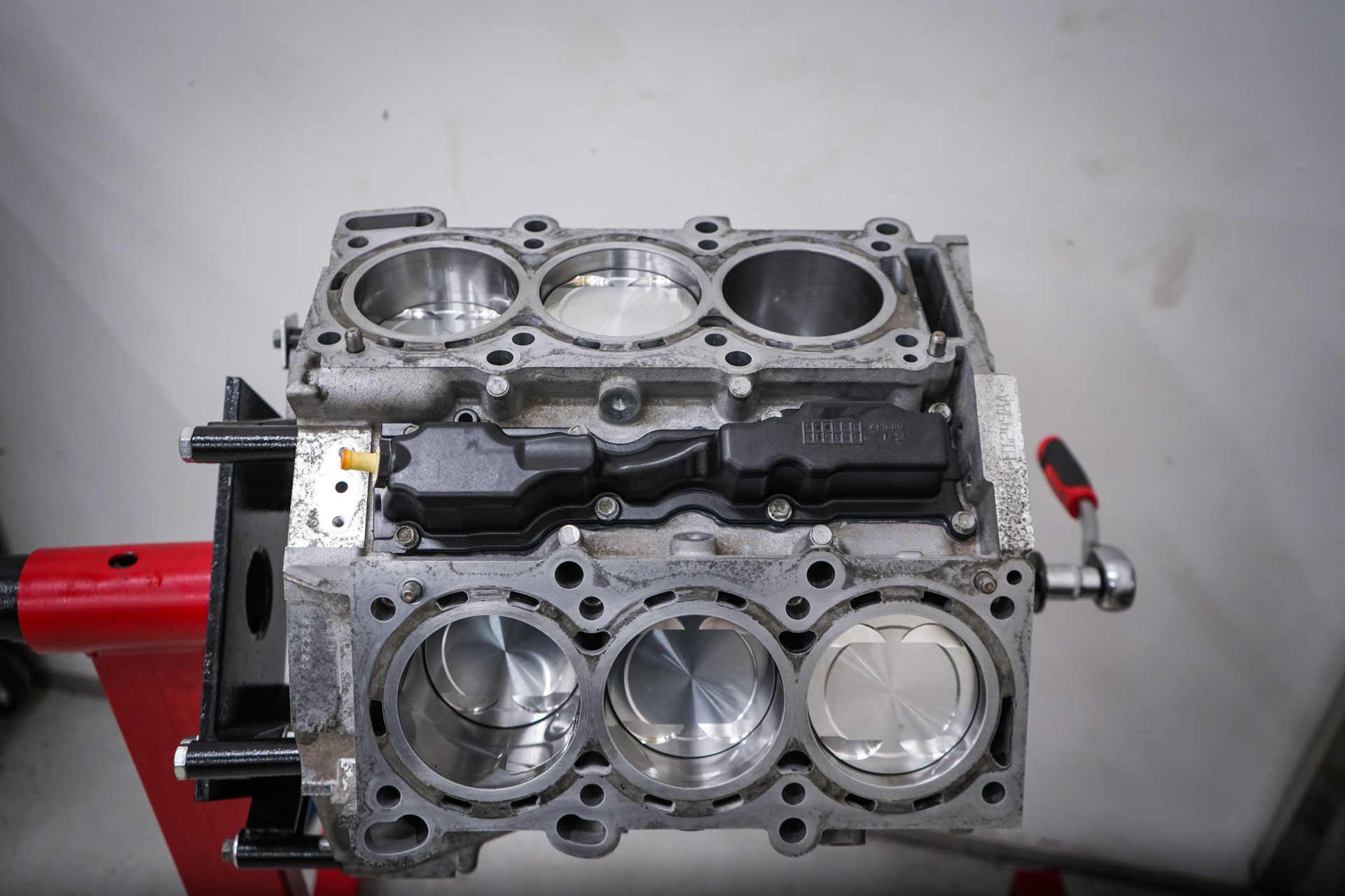 Moottori oli aiemmin rakennettu muualla ja kilometrejä oli kertynyt jo n. 60 000. Vuoden vaihteessa 24-25 päätettiin tarkistaa moottorin kunto. Tarkistuksessa selvisi, että männissä oli halkeamia ja useammasta männästä puuttui paloja. Teimme myös muita huomioita, jotka vahvistivat epäilyksemme moottorin purkamiselle. Lisäksi, männät olivat liian pienellä välyksellä takomännille tyypillisesti suurempaa välystä tarvitsevaan käyttöön. Moottoria oli mahdollisesti myös lämmitetty puutteellisesti, mikä lisää riskiä vaurioihin takomännillä ajettaessa.