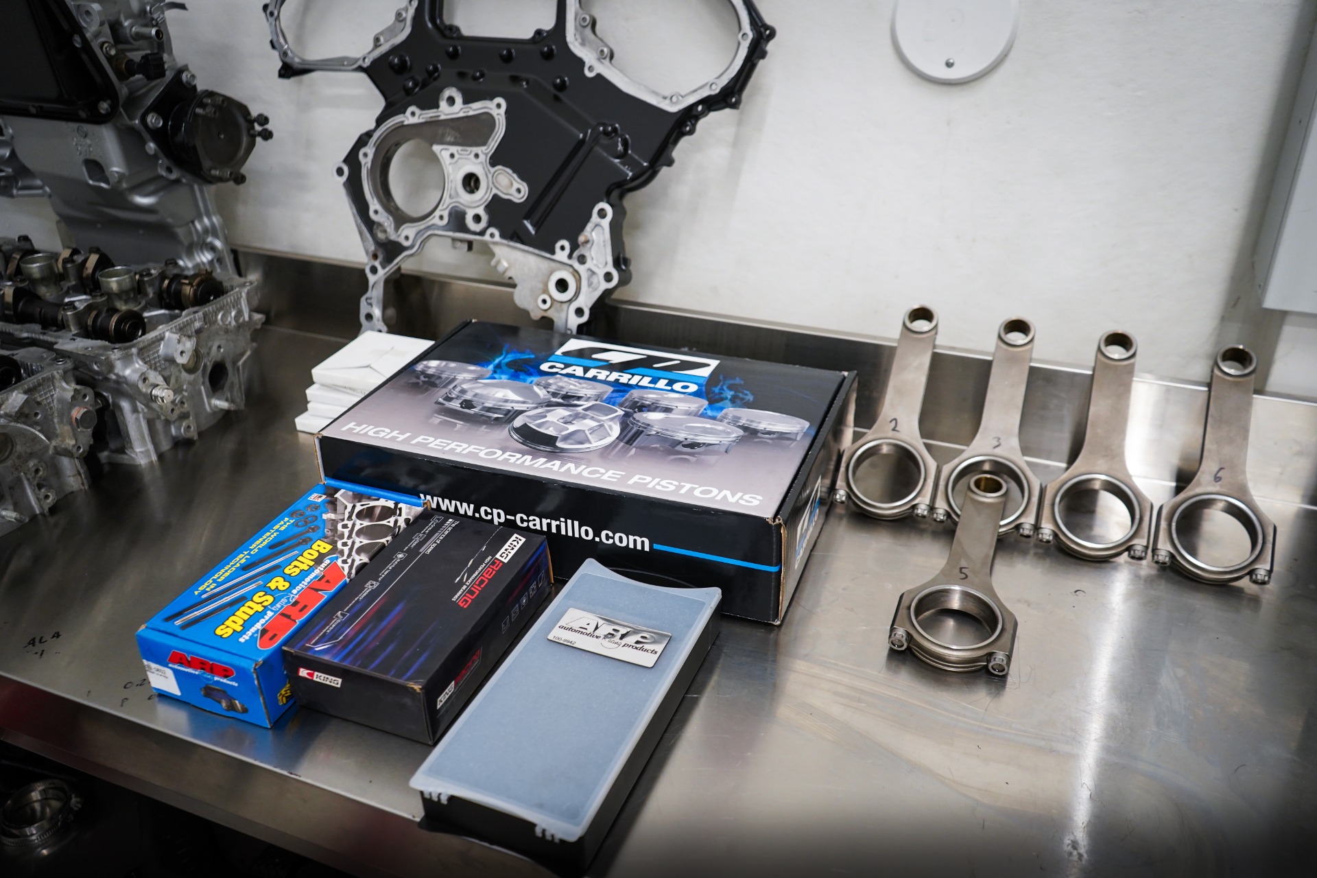 Lohko puhdistettiin, sylinterit kevythoonattiin, jonka jälkeen ne mitattiin ja tilattiin sopivat CP-takomännät sekä Carrillo kiertokanget. Välykset mitattiin ja määriteltiin sopiviksi käyttötarkoitukseen.